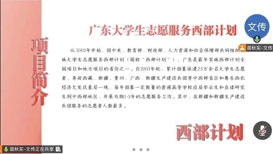 3月27日,太阳城娱乐召开西部计划及“百千万工程”线上宣讲会。此次宣讲会由团委书记苗秋实老师主讲,会上苗老师详细为文传学子介绍项目背景、服务岗位、政策保障,解读招募条件与时间安排,并现场答疑。此次宣讲会帮助毕业生明晰基层服务路径,鼓励大家将个人理想融入国家发展,到祖国最需要的地方奉献青春、实现价值。