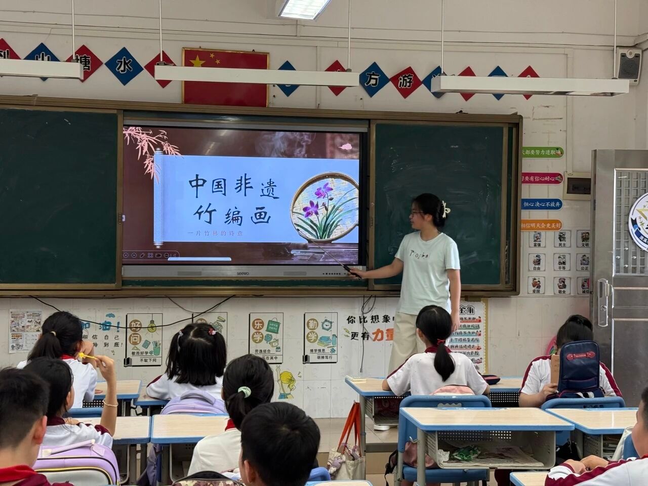 2026年4月7日,春风和煦,广州市从化区流溪小学的教室里迎来了一股清新的文化之风。在语言文字服务团队单涵滪老师的带领下,一场别开生面的非遗课堂在这里展开。本次活动的小老师,是来自2023级汉语言文学专业的卢晴同学。她带领着同学们走进了中国传统手工艺——竹编的奇妙世界,并亲手制作了独一无二的竹编画。