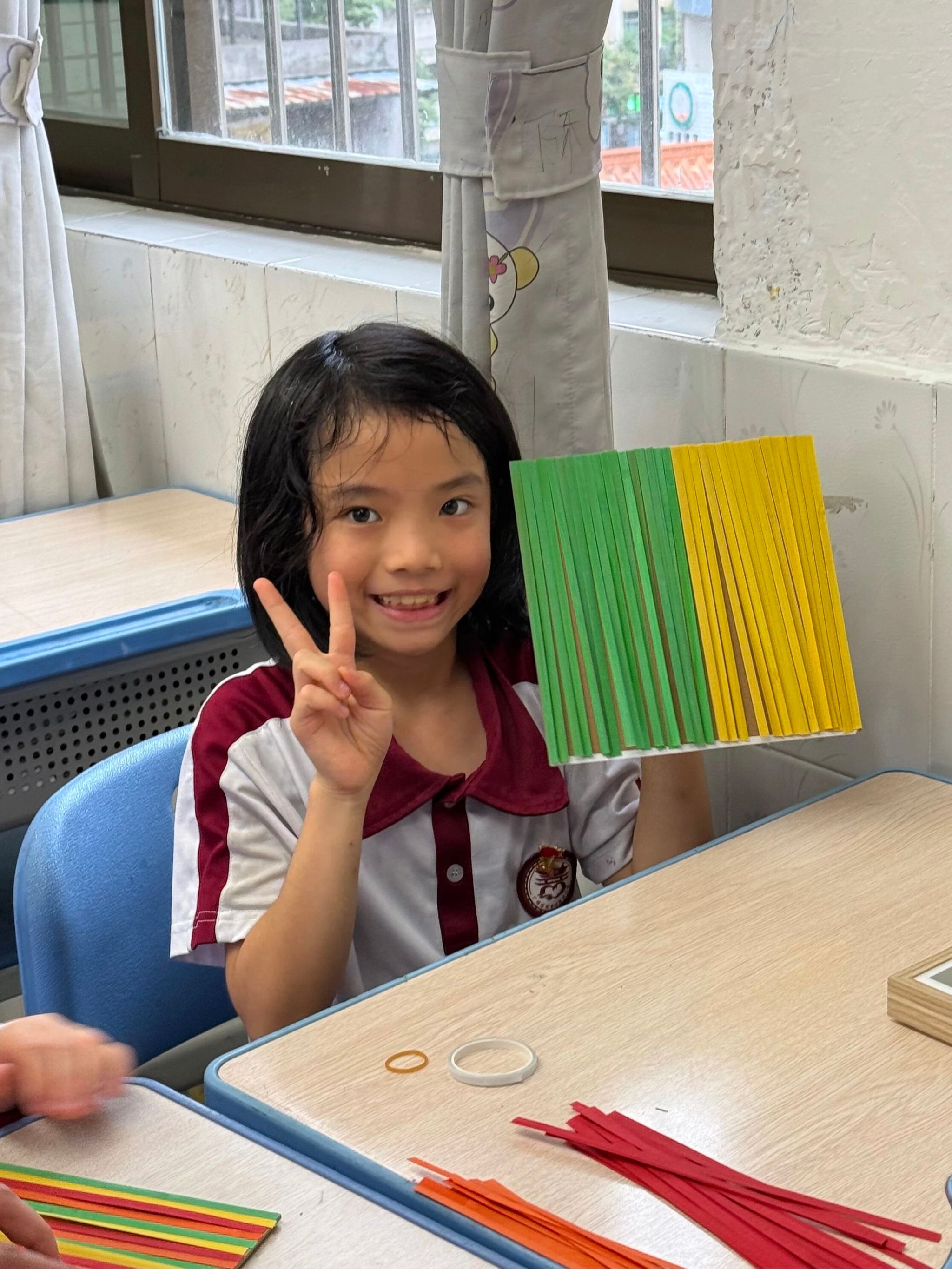 理论学习过后,最激动人心的手工制作环节开始了!孩子们拿到色彩缤纷的竹篾、相框、双面胶和模板卡纸,准备制作属于自己的竹编画。大家跟着小卢老师的步骤,先在相框底板上粘贴双面胶,然后将彩色竹篾按照自己的喜好整齐排列粘贴。接着,最关键的编织步骤来了,孩子们学习“挑一压一”的方法,将横向的竹篾交错编织进去,看着原本单调的底板渐渐呈现出精美的图案。遇到难题时,孩子们积极举手求助,小老师也耐心地一一指导。师生间的互动交流,不仅提高了孩子们的动手能力,更让整个课堂充满了欢声笑语。