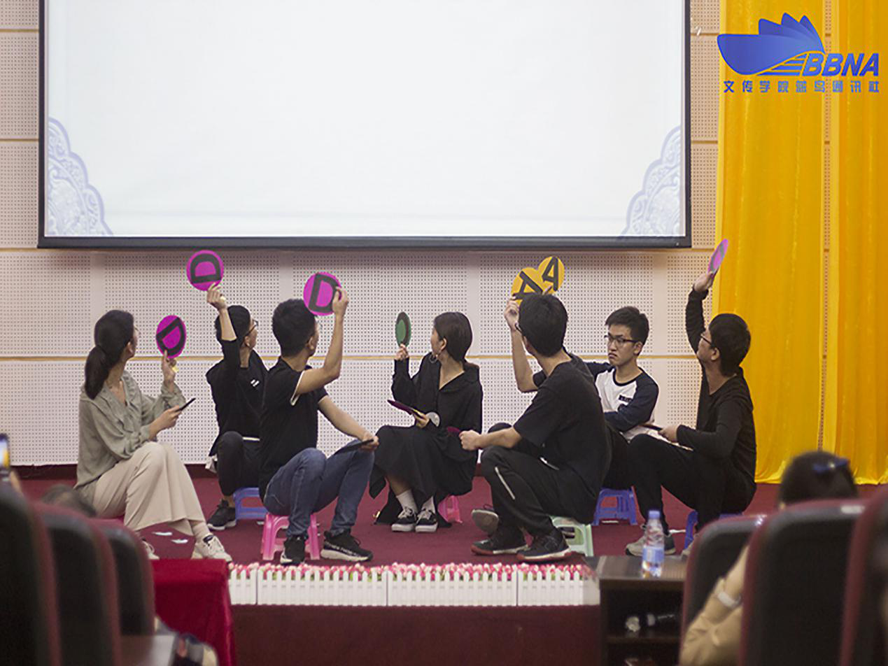 随后,便是今晚的另一出重头戏——团体赛。比赛分为三轮。第一轮的趣味赛采取了近年流行的游戏“你画我猜”,题目大多是成语、词语和俗语,获胜队伍可在道具赛中优先选择道具。负责比划的选手使出浑身解数进行表演,负责猜的选手冥思苦想,大家齐心协力只为得出正确答案。台上选手生动的表演引得台下的观众捧腹大笑,当选手猜中,台下便会响起掌声。
