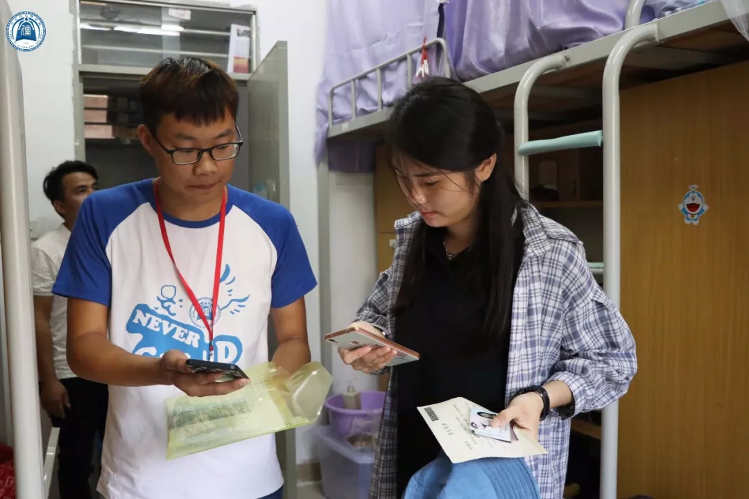 在送了几批新生到宿舍后,17级新闻学的黄同学终于有了一点空闲。她是这一届的新生学班之一。问到今天工作的感想,她对工作繁忙和辛苦未提一字,却关心着新同学。