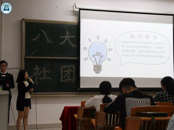 在社团展示的环节中,八大社团尽展才艺,各具特色。魅声歌唱队为大家带来一曲《告白气球》,用歌声征服全场,希望新成员在团队里得到提升、收获成长;翔翼文学社秉承着“展心灵之巨翼,传扶摇而上翔”的理念,引领新成员们进一步了解其团队组织和构架;丽影舞蹈队则用轻盈优美的民族舞开场,用最直观的方式为动员大会宣传造势;紫阳戏剧社为我们带来了近几年的表演剪辑,充分展示出“紫阳魅力,由我演绎”的戏剧社特色。随后,其他社团代表也逐一上台,为本次大会宣传动员。