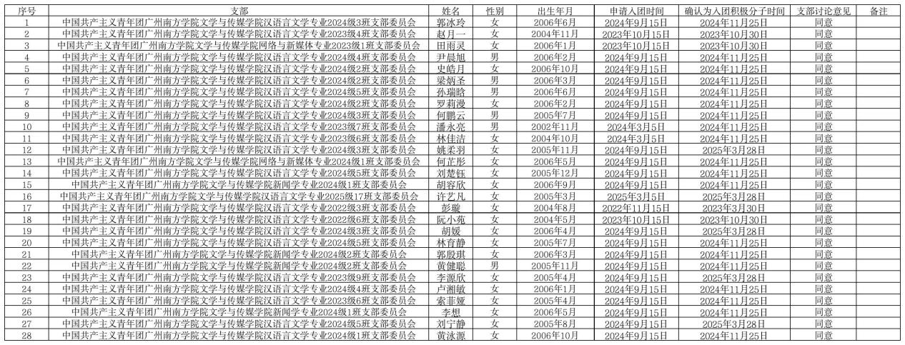 根据《团章》发展团员的相关规定,按照《中国共产主义青年团发展团员工作细则》,由青年提交入团申请,通过入团谈话、征求团员群众意见等流程,经团支部委员会讨论确定,院团委预审,推荐郭冰玲等28名同学为2025年秋季入团发展对象,现将名单公示如下:
