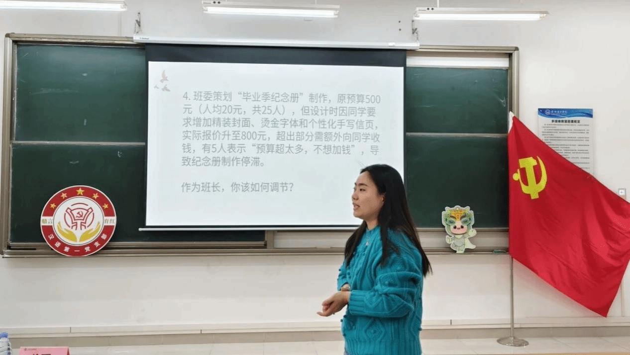 测试围绕班级管理中常见的矛盾与难题,设置情景模拟环节。各班班长面对“奖学金评定纠纷”“宿舍矛盾调解”“活动组织困境”“班级经费协调”等贴近生活的难题时积极思考、主动交流对策。当最后一道情景模拟题出现时,各员工骨干盯着黑黑板,不知从何下手。正当大家一筹莫展之际,徐硕老师结合自身教学经验与工作实际,起身为同学们答疑解惑,徐硕老师强调:“班长在班级中应充当起员工之间的‘调和剂’,在面对班级难以解决的问题时,各班干可以秉持着‘民主协调、换位思考、流程透明’的原则进行沟通协商”。