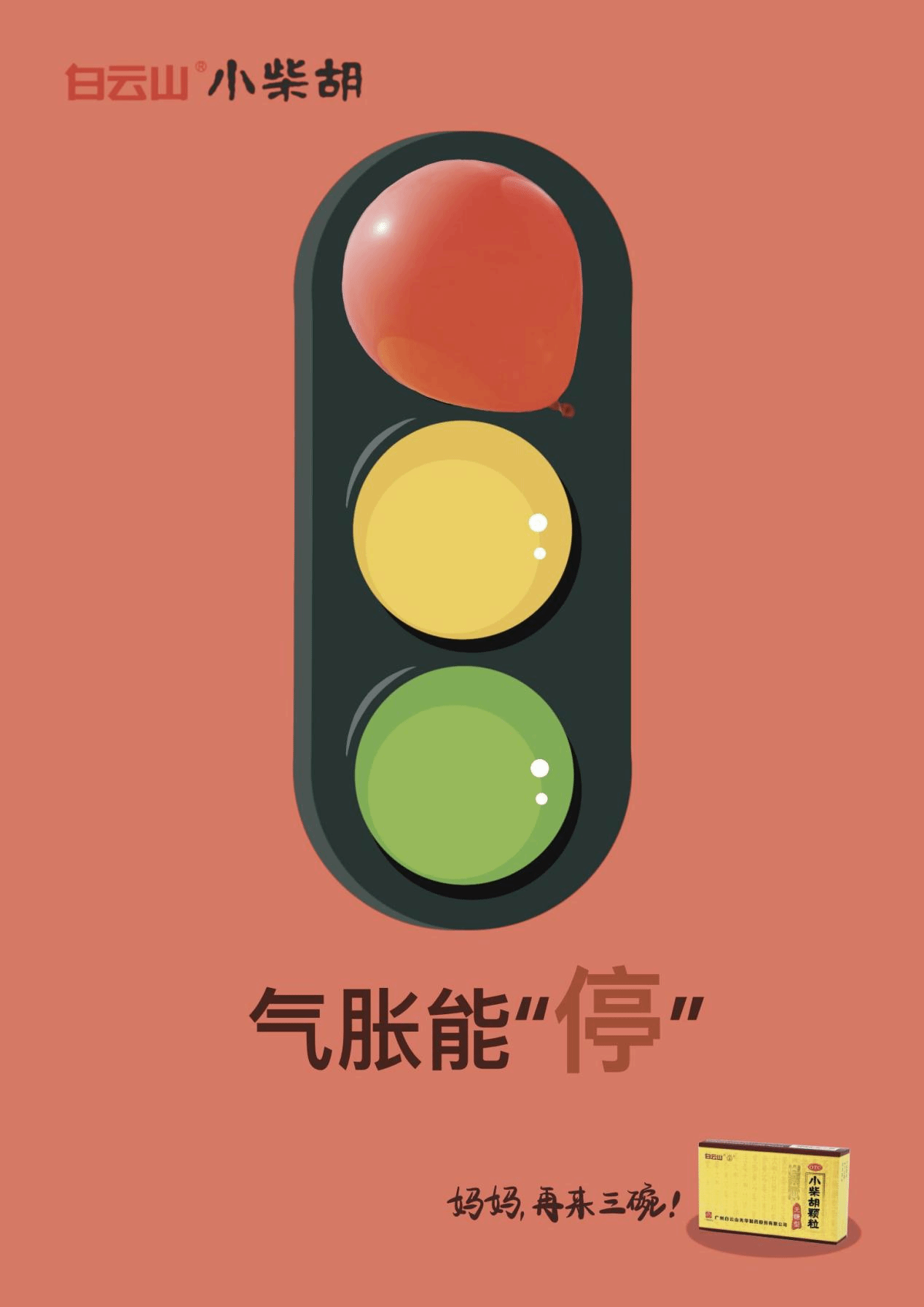 白云山小柴胡颗粒,传承好古方,就像交通信号灯守护交通秩序一样,为我们的身心健康守护。用气球、饼干、苦瓜三个东西把抽象的气胀、咽干、口苦病症形象呈现出来,当身体气胀如红气球般“冒头”,白云山小柴胡它能让气胀“停”住,守护我们的健康;当咽喉无比干且难受时,小柴胡缓解咽干“等”效呵护咽喉;苦口时,化解口苦,助力身体顺畅前“行”。从守护每个小家的健康,到传递遵序守常的好家风,白云山小柴胡颗粒,以古方之力,护家的安康。