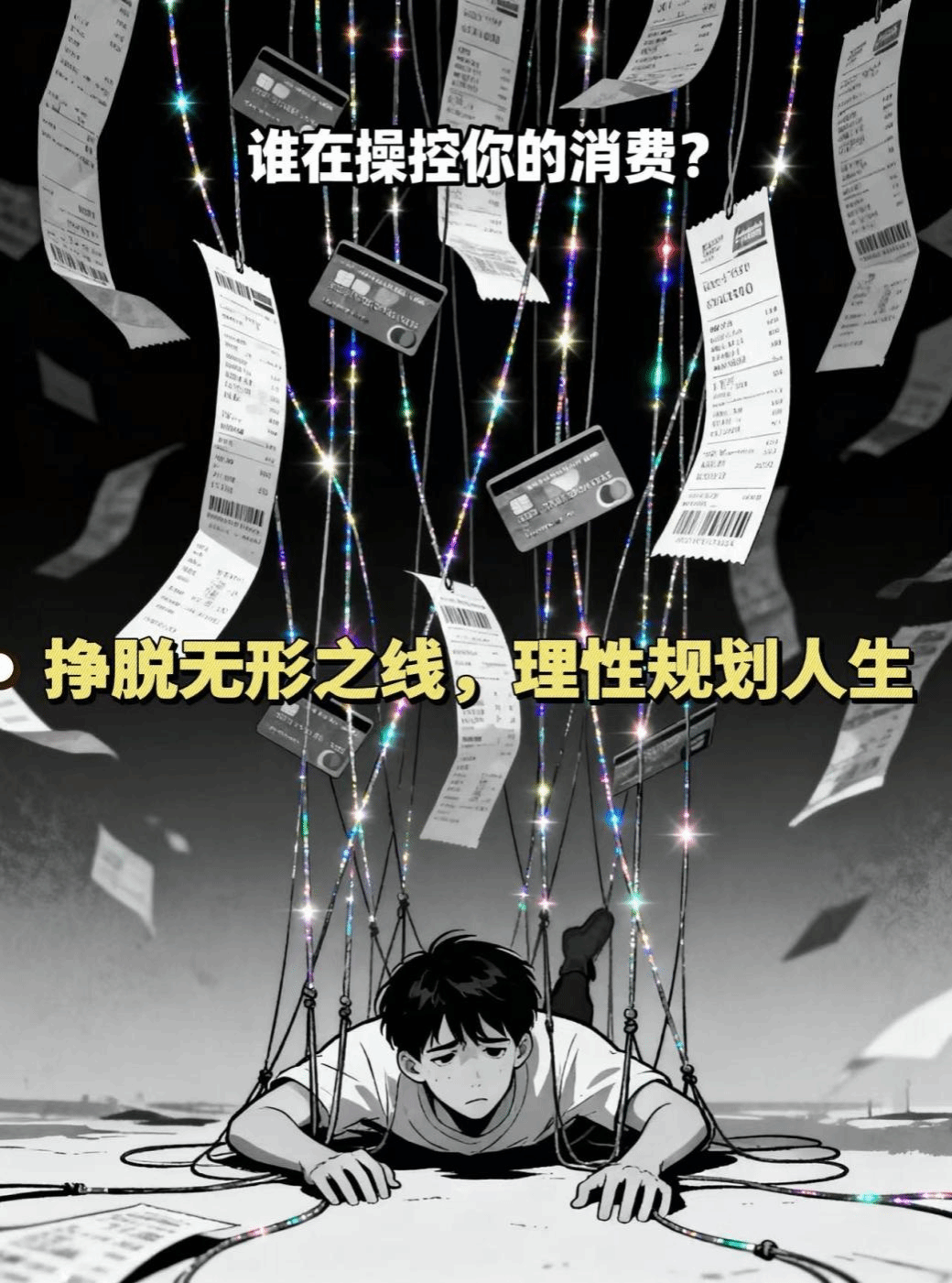 本海报以“提线木偶”为核心隐喻,旨在通过强烈的视觉对比,直观揭示超前消费者在看似自主的消费行为下,实则被欲望与金融工具所操控的可悲境地,引发观众对自身消费习惯的深度反思。