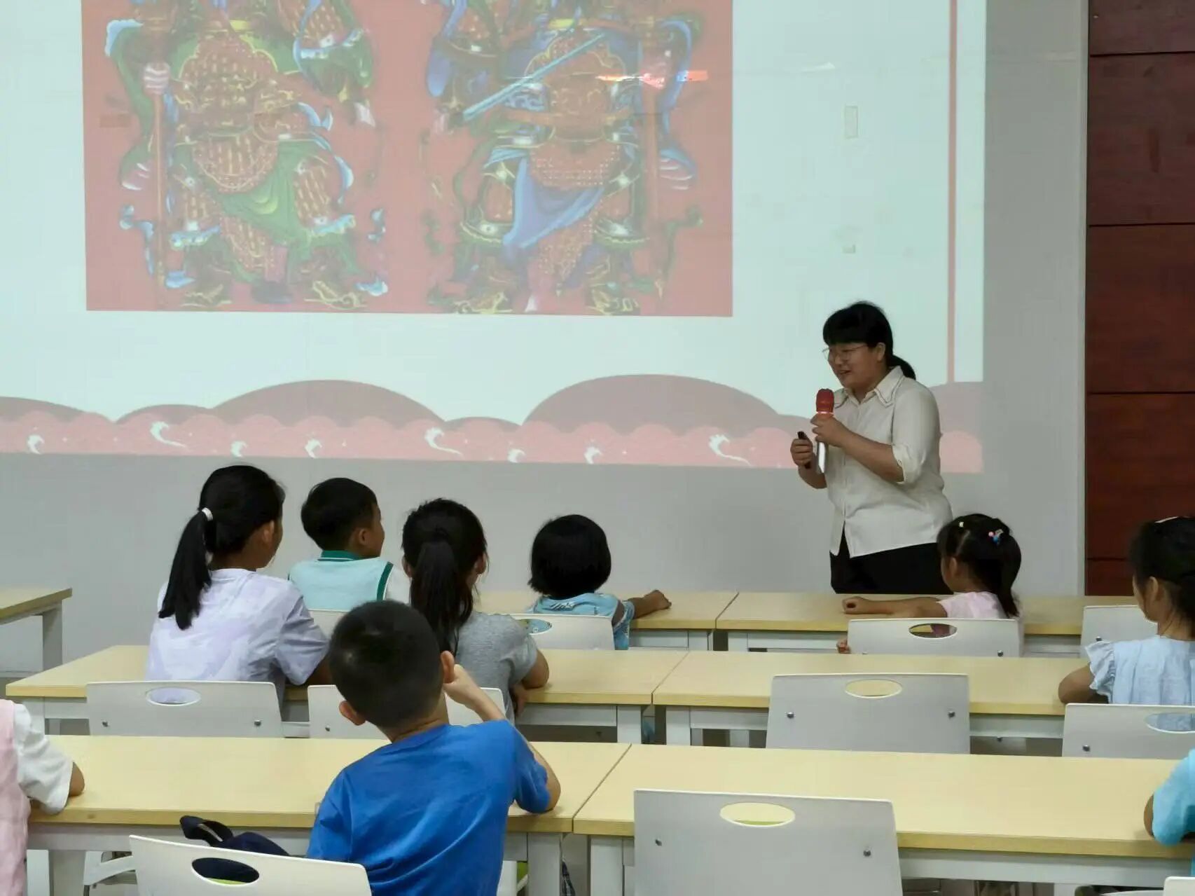 王安妮同学带领小朋友们解读门神传说,溯源上古神荼郁垒至唐代秦琼尉迟恭的演变史,分析武将门神、文官门神、童子门神的信仰分层。同时她指导小朋友们掌握传统工笔技法,引导小朋友们观察门神的色彩、线条、构图,绘制出心中的门神形象,绘制威严守护神像,传承家居辟邪文化,感受中国民间艺术的独特韵味。