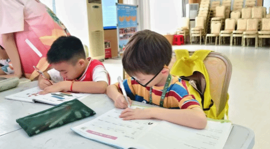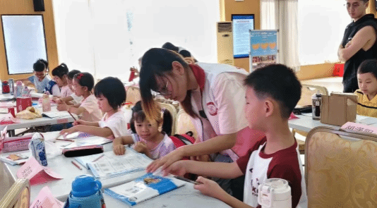 七月流火,蝉鸣阵阵,却挡不住青春的步履与热忱。在这个火热的夏天,文鼎筑梦传薪队的队员们怀揣着赤诚与理想,走进容桂街道振华社区党群服务中心,将知识的种子播撒在小朋友们的心田。7月14日,是义教活动正式开启的第一天,文鼎筑梦传薪队派出三名队员早早便在党群服务中心迎接小朋友们,而其余的7名队员则在三楼教室井然有序地为课程做准备。干净整洁的教室里弥漫着活力与期待的气息。